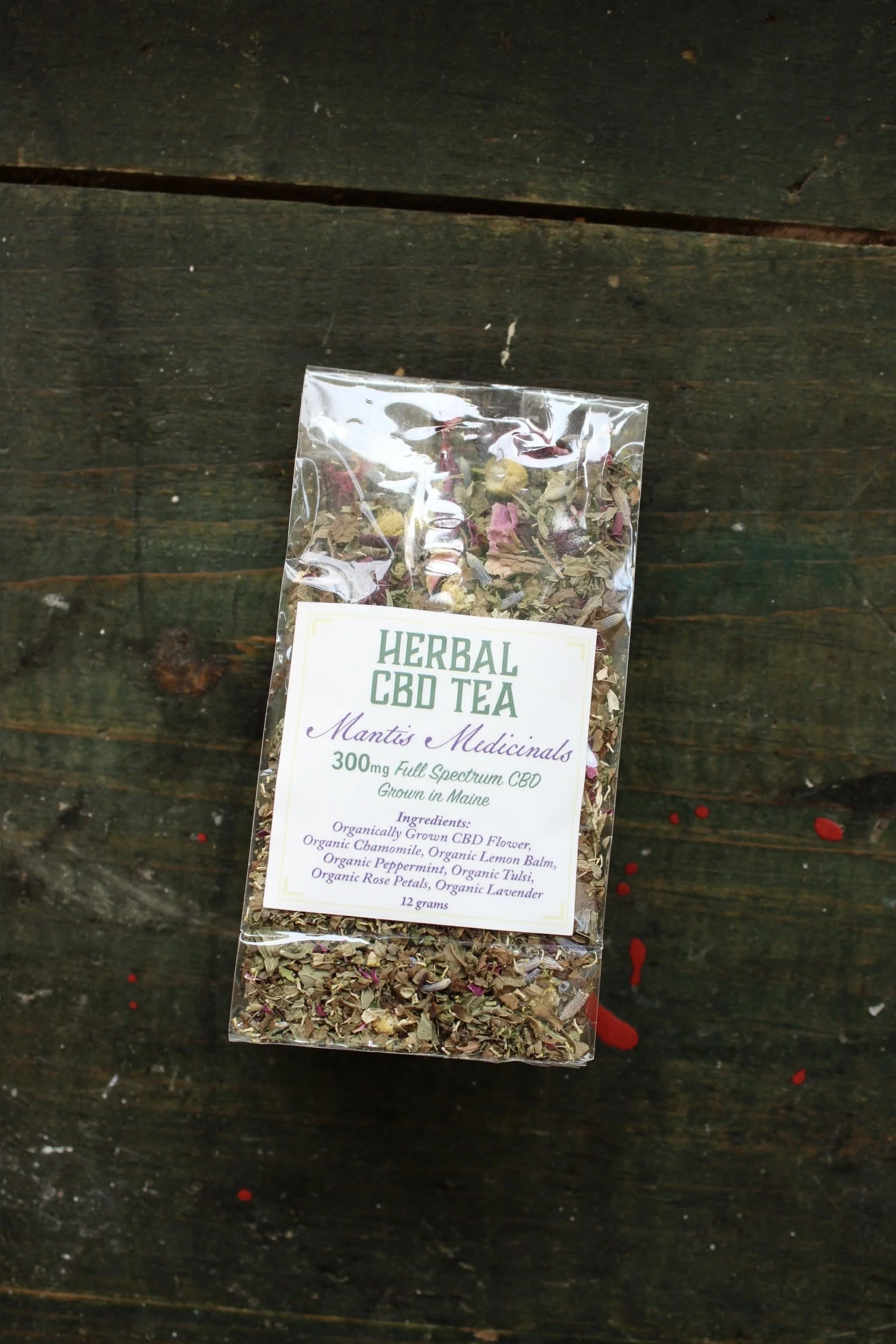 600 mg CBD Herbal Tea: Made with our Organically Grown CBD, Organic Chamomile, Organic Lemon Balm, Organic Peppermint, Organic Tulsi, Organic Rose Petals and Organic Lavender. An absolutely delightful blend of earthy and floral and perfectly calming. I love it before bed. Add 1-2 teaspoons to 8oz of boiling water. 15-30mg CBD per cup of tea. 20-40 servings.