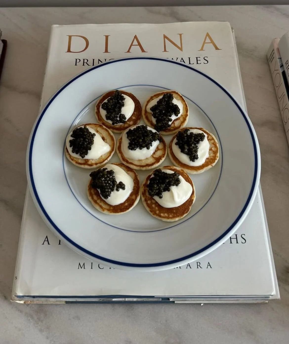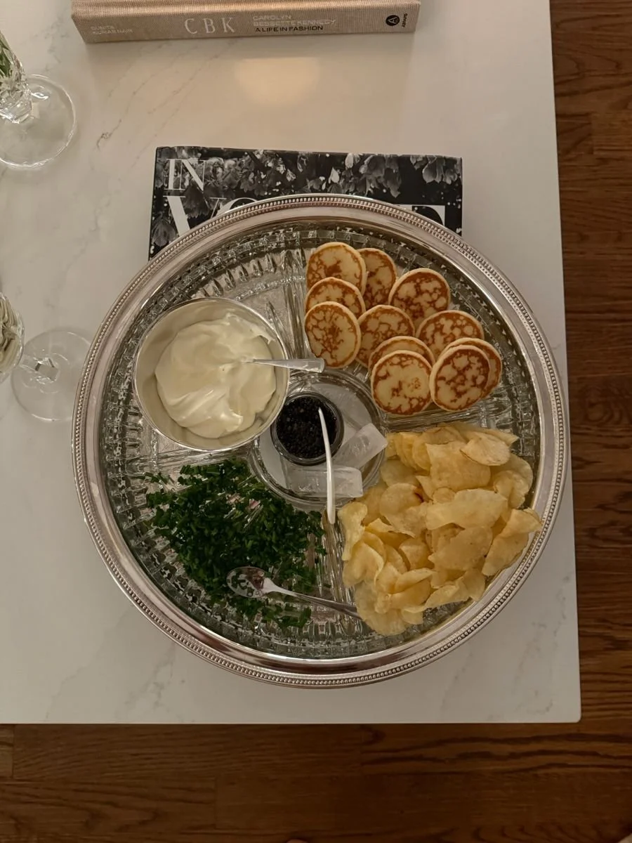 Add a healthy dollop of crème fraîche (1 tbs) to warmed and then brought to room temp blinis. Either scoop a teaspoon size of caviar on top, or fold a three inch (ish) piece of smoked salmon on top. Add slivers of lemon and a small bowl of chopped chives to the serving dish so people can add them if they’d like to.